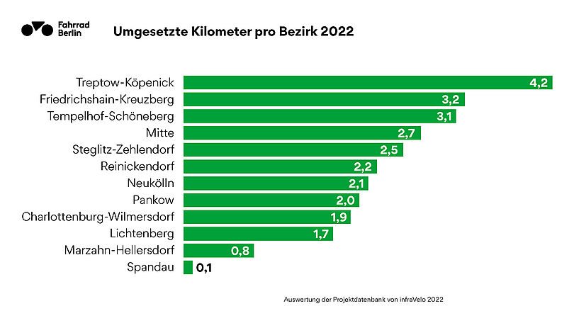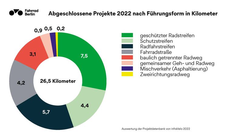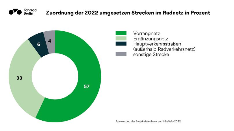 Die dargestellten Zahlen erscheinen im ersten Blick zum Teil niedriger als die Werte der Vorjahre, sind aber aufgrund einer Umstellung der verwendeten Längeneinheit nur bedingt vergleichbar. Um den Fortschritt beim Ausbau der Radinfrastruktur in Berlin vergleichbar zu kommunizieren, erfolgt seit Anfang 2023 die Kommunikation der Maßeinheit Streckenlänge. Das bedeutet, dass eine beidseitige Radverkehrsanlage an einem 1 Kilometer langen Streckenabschnitt als 1 Kilometer umgesetzte Strecke gemessen und kommuniziert wird. Bis 2022 wurden auf der infraVelo-Projektkarte die „Reallängen“ angegeben, bei der die befahrbaren Radwege in beide Richtungen einzeln gezählt wurden. Das heißt, dass die Längen der Radverkehrsanlagen von beiden Straßenseiten summiert wurden.
