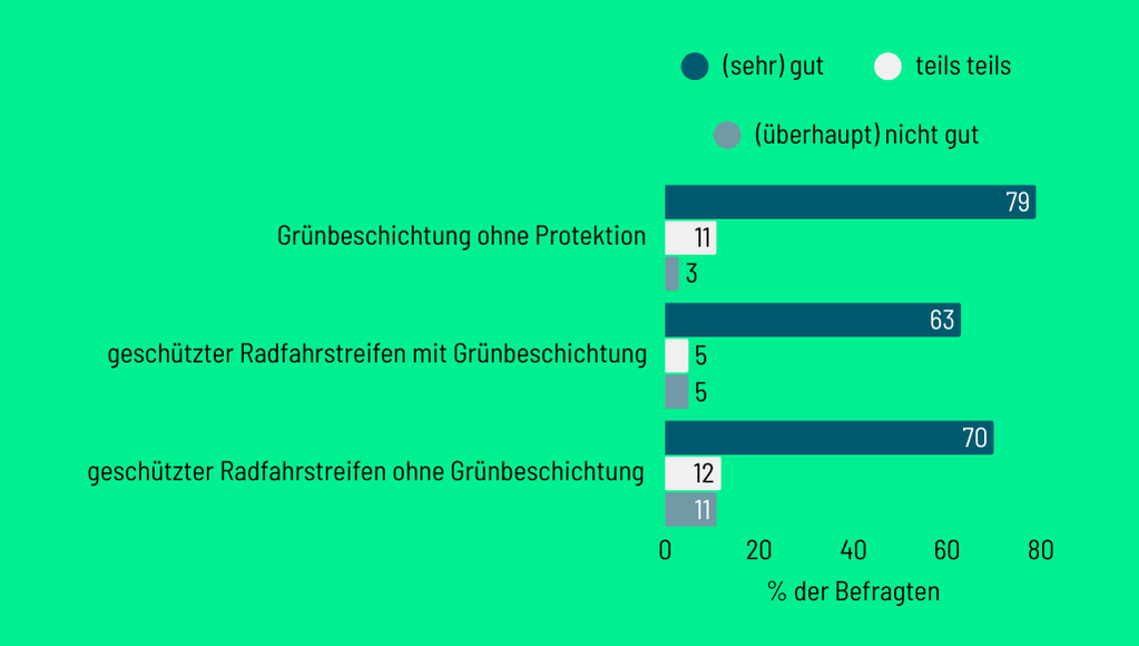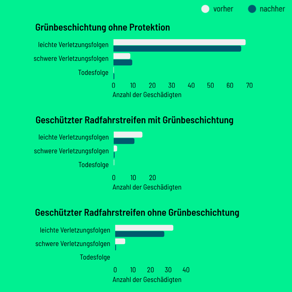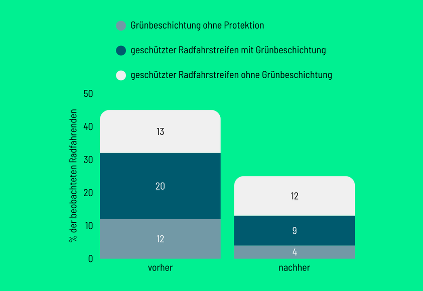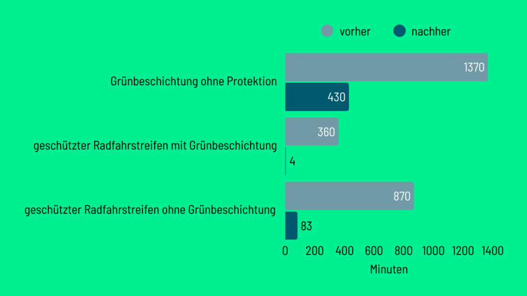 Grünbeschichtungen auf geschützten Radfahrstreifen reduzieren das Falschparken von Autos auf den Radfahrstreifen deutlich. Die Begleituntersuchung kommt zu dem Ergebnis, dass auf elf geschützten und grünbeschichteten Radfahrstreifen Autos dort im Schnitt nur etwa vier Minuten innerhalb von vier Stunden hielten. Auf geschützten Radfahrstreifen ohne die grüne Markierung waren es ganze 83 Minuten – also mehr als das Zwanzigfache.