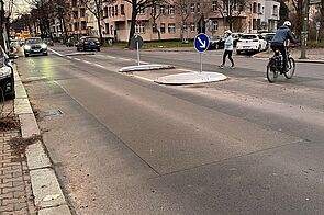 Damit auch Radfahrende auf der Potsdamer Straße zügig und komfortabel vorankommen, wurde zwischen Baseler Straße und Ringstraße das Kopfsteinpflaster durch Asphalt ersetzt. Der Parkstreifen wurde wieder gepflastert.