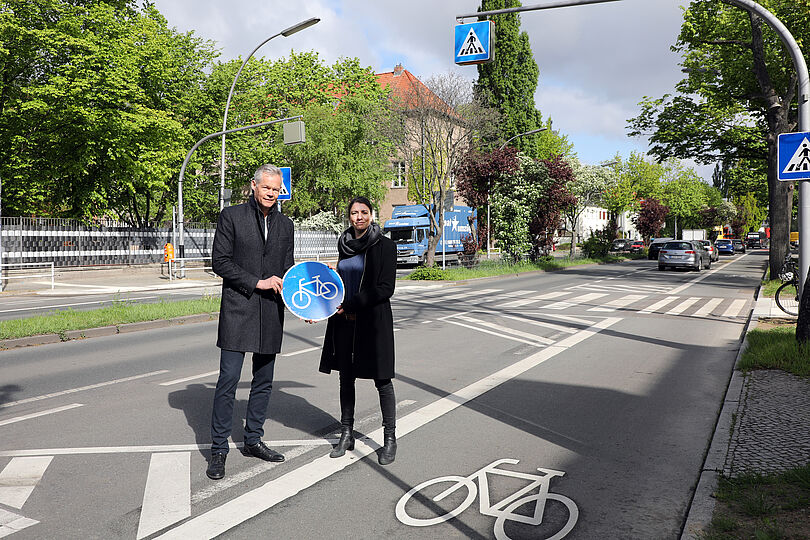 Bezirksstadträtin Dr. Saskia Ellenbeck und infraVelo-Geschäftsführer Christoph Schmidt haben heute gemeinsam die neue Radverkehrsanlage im Abschnitt zwischen Hoeppnerstraße und Dudenstraße eingeweiht. Auf einer Streckenlänge von knapp 1,5 Kilometern besteht jetzt auf beiden Seiten ein durchgängiger Radfahrstreifen.