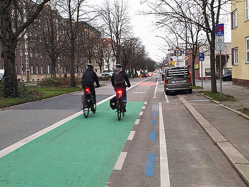 - Die neuen Radverkehrsanlagen haben in der Regel eine Breite von 2,50 Meter und einen breiten Sicherheitstrennstreifen zu parkenden Autos. Das vermeidet sogenannte „Dooring“-Unfälle – Zusammenstöße mit plötzlich geöffneten Autotüren. Durch die rote Beschichtung in den Kreuzungsbereichen ist der Verkehrsraum von Radfahrenden besser sichtbar.