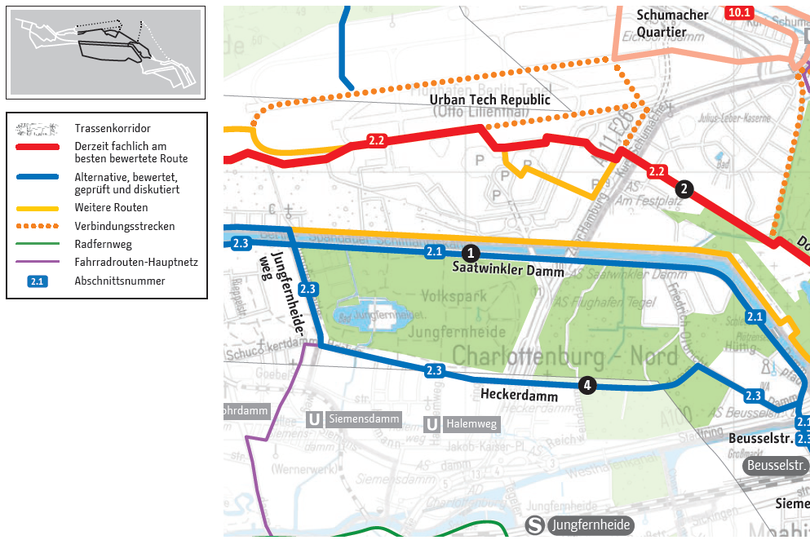 Die Radschnellverbindung „Mitte – Tegel – Spandau“ führt auf etwa 14 Kilometern durch die Bezirke Spandau, Reinickendorf, Mitte und Charlottenburg-Wilmersdorf. Damit verbindet sie Spandau Nord über Gartenfeld und die Urban Tech Republic mit dem Hauptbahnhof. Die alltagstaugliche Pendlerroute soll neue Wohn- und Arbeitsquartiere einbeziehen und den touristischen Radfernweg Berlin – Kopenhagen ergänzen. Im Bereich des Schumacher-Quartiers ist zudem eine Anbindung an die Radschnellverbindung Reinickendorf-Route geplant.