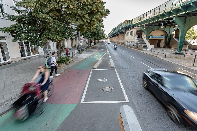 Die Schönhauser Allee ist eine Hauptverkehrsstraße in einem beengten, öffentlichen Straßenraum. Es gibt viele Geschäfte, die auf Lieferungen angewiesen sind, Arztpraxen mit mobilitätseingeschränkten Patient*innen und nicht zuletzt den Verkehrsstrom aus Straßenbahn, Autos, Fußgänger*innen und Radfahrenden. Die größte Herausforderung bestand darin, hier die Vorgaben des Mobilitätsgesetzes umzusetzen und die Radverkehrsinfrastruktur breiter und sicherer zu gestalten. Bei der Planung mussten wir einen Kompromiss mit allen Verkehrsarten – Straßenbahn, Bus, Fußverkehr, Lieferverkehr, Straßenreinigung, Notfalldiensten und Schienenersatzverkehr – finden. Der Radverkehr sollte z. B. den Straßenbahnverkehr nicht ausbremsen, die Fußgänger*innen sichere Querungsmöglichkeiten und die Gewerbetreibenden Lieferzonen bekommen. Für Letzteres haben wir eine Umfrage unter den ansässigen Geschäften auf der Schönhauser Allee durchgeführt, um besser zu verstehen, was gebraucht wird und das auch in der Planung entsprechend zu gestalten. Als Ergebnis haben wir mehr Ladezonen als vorher eingerichtet. Und auch Stellplätze für mobilitätseingeschränkte Personen haben wir berücksichtigt. Insgesamt konnten wir alle Herausforderungen gut meistern, indem wir in einem stetigen Austausch mit dem Straßen- und Grünflächenamt Pankow, den entsprechenden Genehmigungsbehörden der Senatsverwaltung, mit der BVG und der BSR standen.