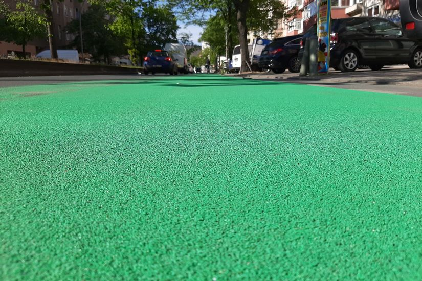 Seit April wurden somit 6,6 Kilometer Radfahr- und Schutzstreifen in den vier Bezirken grün beschichtet. Die Grünbeschichtung erneuert nicht nur die Oberfläche der bestehenden Wege, sondern entfaltet auch eine Signalwirkung, mit der die Berliner Radfahrer*innen im Straßenverkehr sichtbarer unterwegs sind.