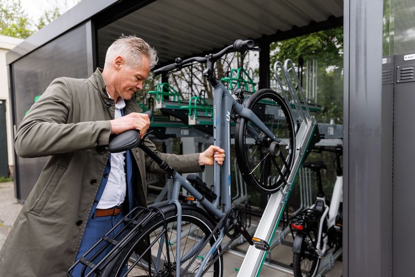 infraVelo-Geschäftsführer Christoph Schmidt parkt ein Fahrrad in der neuen Sammelschließanlage am S-Bahnhof Friedrichsfelde-Ost. | © infraVelo / Frank Sperling