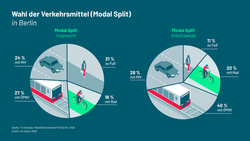 Die Berliner*innen legen fast die Hälfte ihrer Wege zu Fuß oder mit dem Rad zurück, mehr als Dreiviertel im Umweltverbund. Mit dem Rad zur Arbeit fahren 20 Prozent, für diesen Weg ist der ÖPNV mit 40 Prozent die erste Wahl. Dem MIV (motorisierten Individualverkehr) kommt ein geringer Anteil zu – der MIV ist also nicht das meistgenutzte Verkehrsmittel in Berlin. Mit einer verbesserten Infrastruktur, ausgebauten Radwegen und ausreichenden und sicheren Fahrradabstellanlagen kann der Radverkehrsanteil am Modal Split vor allem in Großstädten noch weiter erhöht werden.