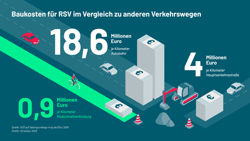Bei den geplanten Radschnellverbindungen werden Kosten und Nutzen häufig in Frage gestellt. Dabei betragen die Baukosten für einen Kilometer Radschnellverbindung einen Bruchteil im Vergleich zu einem Kilometer für eine Hauptverkehrsstraße oder für eine Autobahn. Nicht einmal fünf Prozent der Kosten für einen Kilometer Autobahn fallen für einen Kilometer einer Radschnellverbindung an. Um den Radverkehrsanteil in Berlin zu erhöhen, sieht das Berliner Mobilitätsgesetz den Bau von Radschnellverbindungen vor. Investitionen in Radschnellverbindungen sind sozioökonomisch lohnenswert, da die Verlagerung vom Auto aufs Fahrrad bei einer gut ausgebauten Infrastruktur statistisch bereits nachgewiesen wurde.
