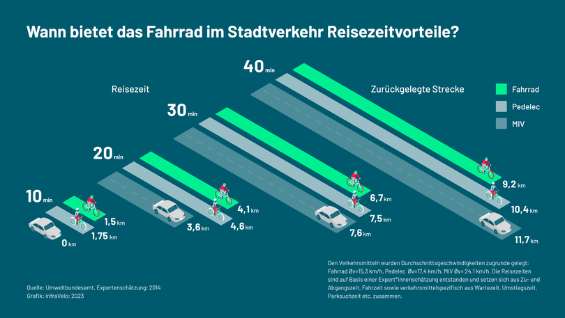 Von Tür zu Tür im Stadtverkehr: Eine Untersuchung des Umweltbundesamts hat ergeben, dass Fahrrad und Pedelec – und nicht der MIV (motorisierte Individualverkehr) – bei Strecken unter fünf Kilometern oder bei einer Reisezeit unter 30 Minuten häufig die schnellsten Verkehrsmittel sind und damit Reisezeitvorteile liefern. Gesünder und klimafreundlicher ist es zudem allemal.