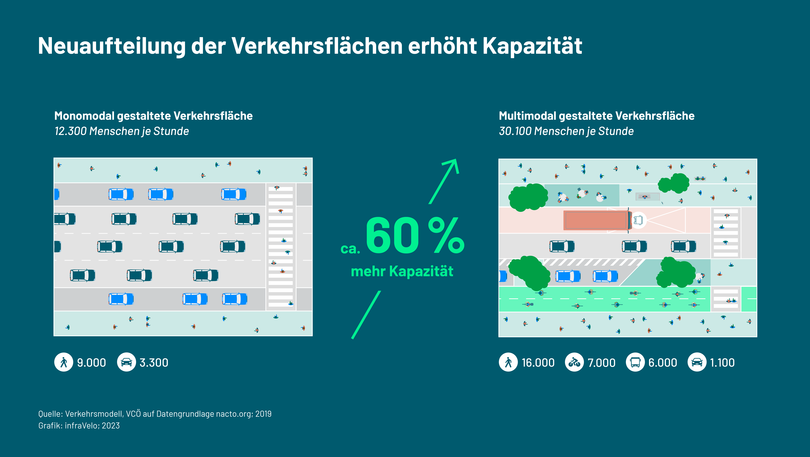 Straßen und Verkehrsflächen wurden lange Zeit monomodal geplant, ausgerichtet allein auf Kraftfahrzeuge wie Pkw. Die Mobilität der Zukunft sieht dagegen erhöhte Bedarfe für eine multimodale Gestaltung der Verkehrsflächen, die auch für Zufußgehende Aufenthaltsqualitäten bietet und neue grüne Lebensräume in der Stadt schaffen kann. Werden dem Fuß- und Radverkehr sowie dem ÖPNV mehr Platz eingeräumt, steigert das auch die Kapazität der Verkehrsfläche. Während eine auf den MIV (motorisierten Individualverkehr) ausgerichtete Straße in einer Stunde von maximal 12.300 Menschen passiert werden kann, sind es bei einer multimodalen Verkehrsfläche 30.100 Menschen, die im ÖPNV, auf Rädern, zu Fuß oder im Auto unterwegs sind.
