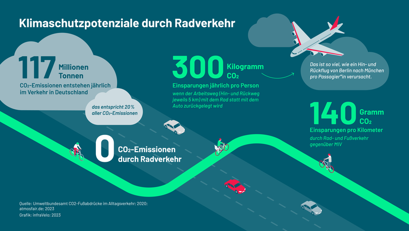 Wie umweltfreundlich ist Radfahren? Radverkehr verursacht keine klimaschädigenden Emissionen, ist platzsparend und leise. Im Vergleich dazu entstehen in Deutschland jährlich 117 Millionen CO2-Emissionen im Straßenverkehr, das entspricht rund 20 Prozent aller Emissionen. Der Umstieg vom Auto aufs Rad für den Arbeitsweg würde pro Person jährlich bis zu 300 kg CO2-Einsparungen ermöglichen, so viel wie ein Flug von Berlin nach München pro Passagier*in verursacht. Das verdeutlicht, wer aufs Rad umsteigt und sein Mobilitätsverhalten ändert, trägt zum Klimaschutz bei.