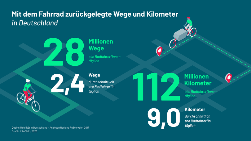 Summiert man die mit dem Fahrrad zurückgelegten Wege und Kilometer, erhält man beachtliche Zahlen: Ganze 28 Millionen Wege legen Radfahrer*innen in Deutschland täglich zurück. In Kilometern sind das 112 Millionen pro Tag, das ergibt durchschnittlich 9 Kilometer pro Radfahrer*in. Diese Zahlen werden durch das Aufkommen von E-Bikes und Pedelecs in den kommenden Jahren voraussichtlich noch steigen – und damit auch die Bereitschaft, vom Pkw auf das Rad umzusteigen.