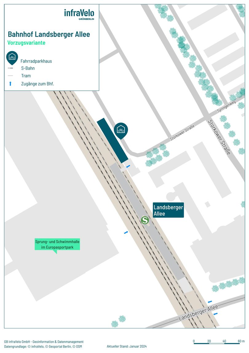 Für den S-Bahnhof Landsberger Allee im Bezirk Pankow wurde im Rahmen der Standort- und Potenzialanalysen ein sehr hoher Bedarf an Fahrradstellplätzen ermittelt. Die Prognose ergab, dass bis zum Jahr 2030 insgesamt ca. 650 Stellplätze benötigt werden.