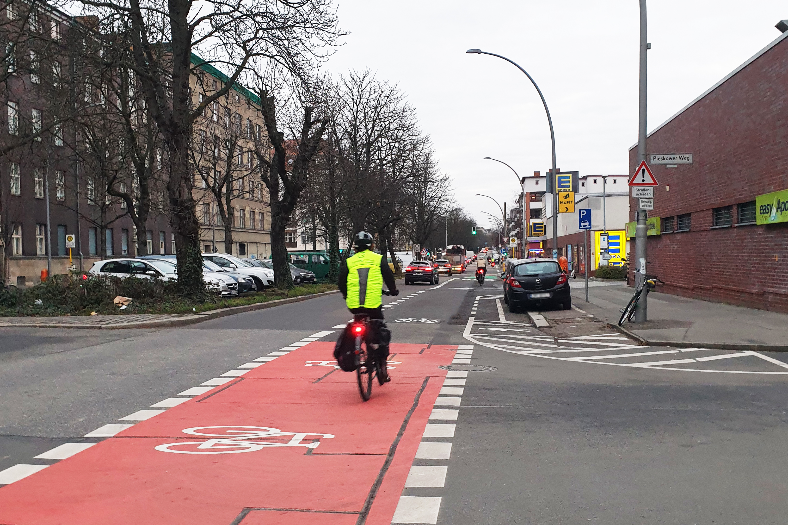 Die Strecke ist Teil des Berliner Vorrangnetzes für den Radverkehr. In Kreuzungsbereichen, Einmündungen und Ausfahrten wurde rote Farbe verwendet, um besondere Aufmerksamkeit zu erzeugen. Die neuen Radverkehrsanlagen haben in der Regel eine Breite von 2,50 Meter und einen breiten Sicherheitstrennstreifen zu parkenden Autos. Das vermeidet sogenannte „Dooring“-Unfälle – Zusammenstöße mit plötzlich geöffneten Autotüren. Durch die rote Beschichtung in den Kreuzungsbereichen ist der Verkehrsraum von Radfahrenden besser sichtbar. Sechs neue Lade- und Lieferzonen erleichtern jetzt das Be- und Entladen – u. a. von größeren Einkäufen und die Zustellung von Waren und Paketen.