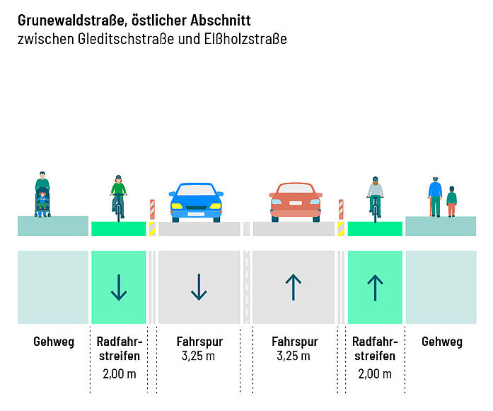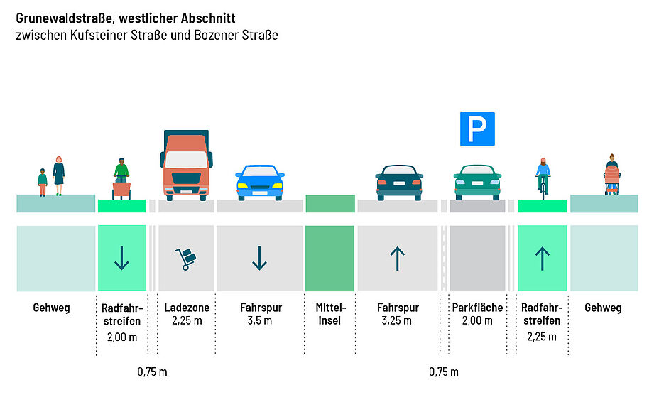 Mit der Einrichtung des Radfahrstreifen und Lieferzonen werden die Flächen für den ruhenden Verkehr neugeordnet. Da die Fahrbahnbreite begrenzt ist, kann nur in manchen Bereichen entlang der Grunewaldstraße Platz für den ruhenden Verkehr erhalten bleiben. Auf diesen Parkflächen können Pkw mit Parkschein oder Bewohnerausweis parken.