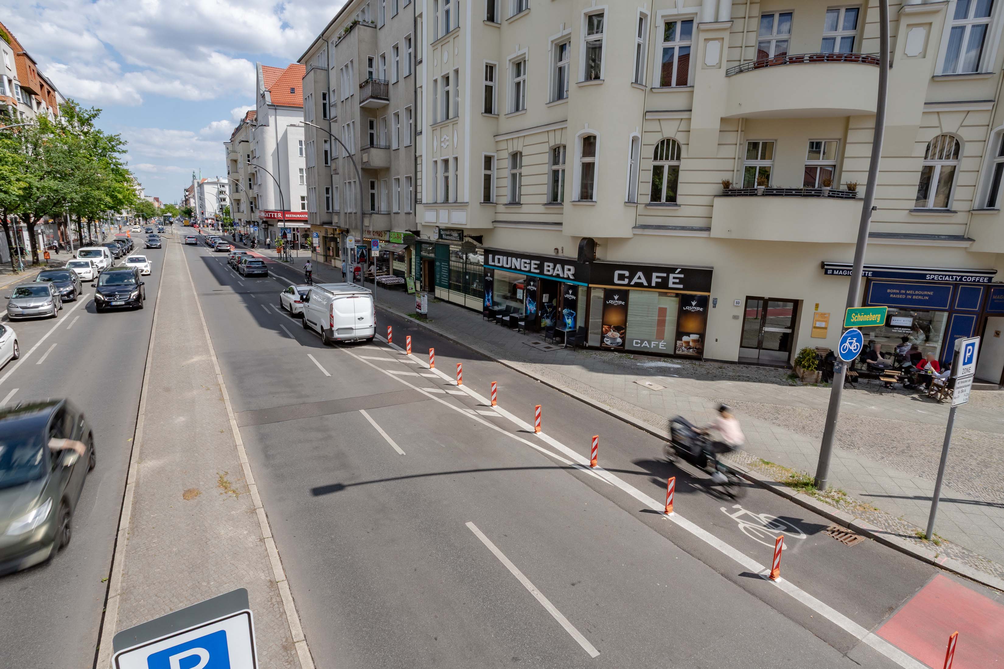 Für den Parkraum direkt in der Grunewaldstraße bedeutet das: Ca. 28% der Parkplätze bleiben direkt erhalten. Hinzu kommen Sonderparkflächen für Taxi- und Lieferverkehr, Parkplätze für schwerbehinderte Menschen sowie Abstellflächen für Fahrräder und Elektrokleinstfahrzeuge. Vor der Umgestaltung parkte der Lieferverkehr häufig in zweiter Reihe im Straßenraum. Für das das Be- und Entladen auch von Privat-Pkw können die Lieferzonen genutzt werden.
