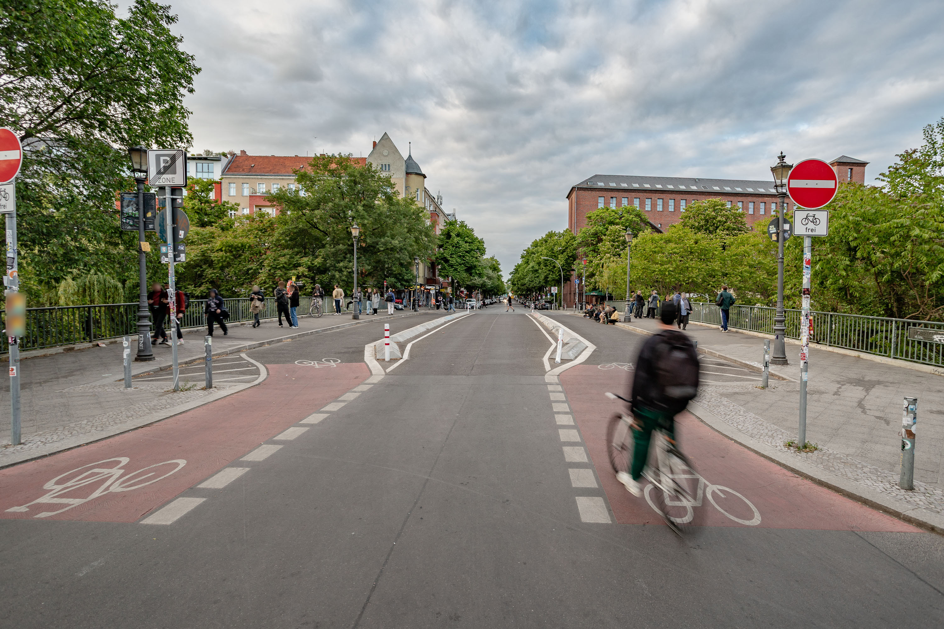 Die Hobrechtbrücke an der Ohlauer Straße und Friedelstraße verbindet die Stadtteile Kreuzberg und Neukölln über den Landwehrkanal. Hier wurde die Verkehrsführung für den Radverkehr verbessert. Im Rahmen eines Konzeptes zur Verkehrsberuhigung wurden im Vorfeld die Abdichtung sowie die Asphaltbeläge auf der Fahr- und den beiden Gehbahnen erneuert. Im Anschluss wurde die Verkehrsfläche dem bezirklichen Verkehrskonzept entsprechend neu aufgeteilt. Neben den Fußwegen wurden getrennte Fahrradspuren eingerichtet.
