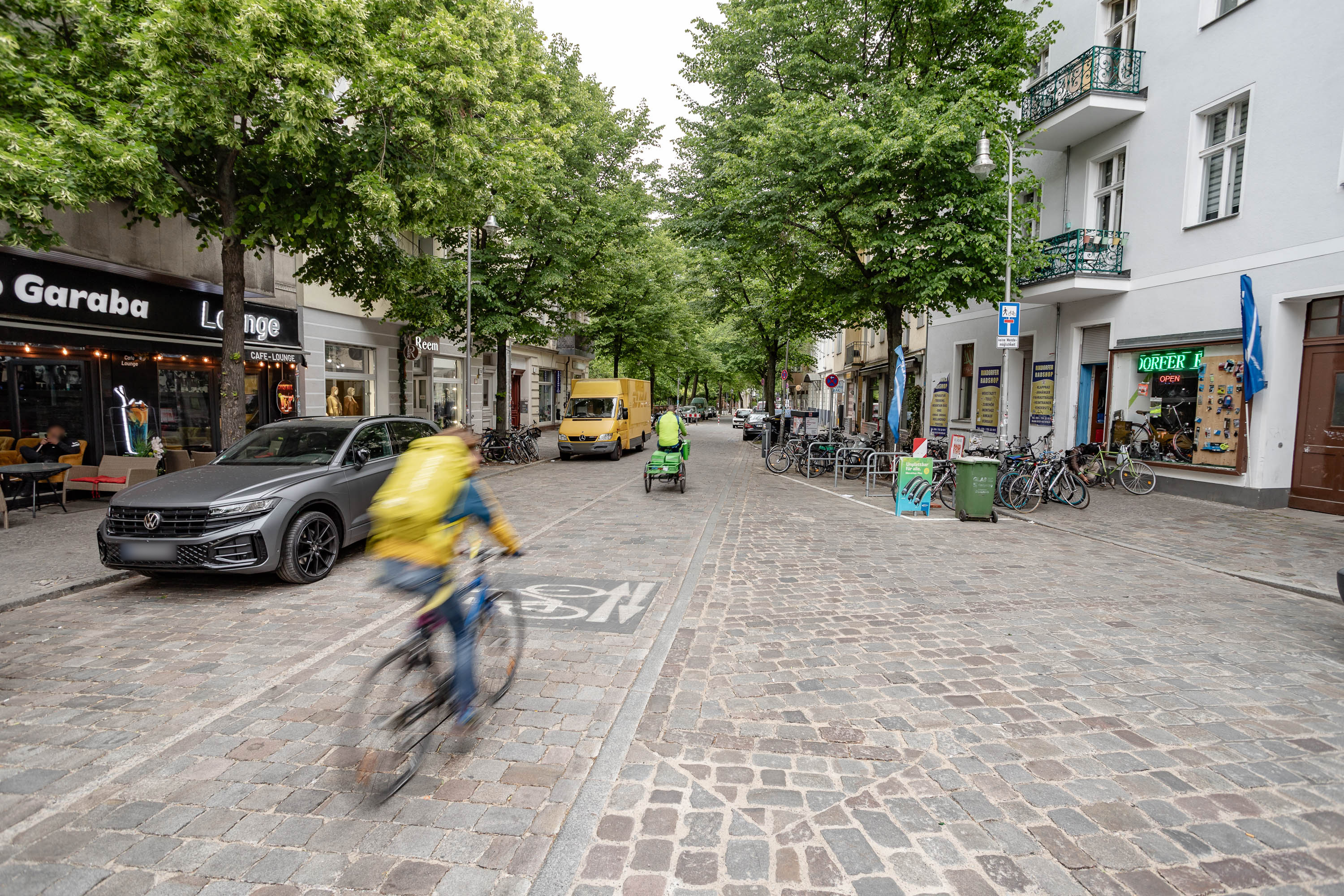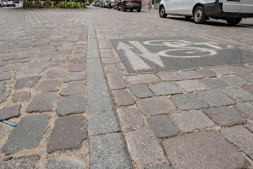 Die Fahrbahn wurde mit gesägtem Großsteinpflaster gestaltet. Dies ist fahrradfreundlich und dennoch bleibt der historische Stadtraum erkennbar.