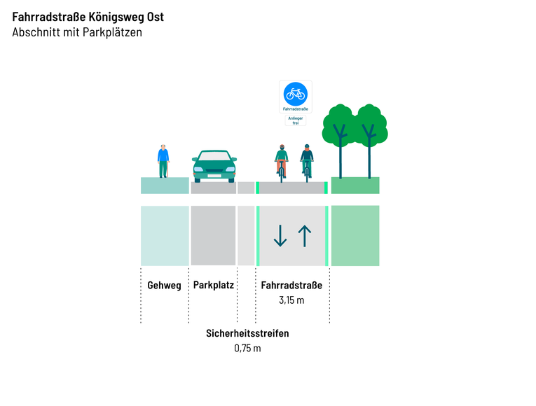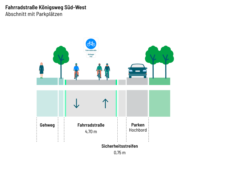 Auf dem Abschnitt Königsweg Südwest wird neben den Stellflächen am südlichen Fahrbahnrand ein 0,75 m breiter Sicherheitstrennstreifen markiert, die Parkplätze bleiben dort erhalten.