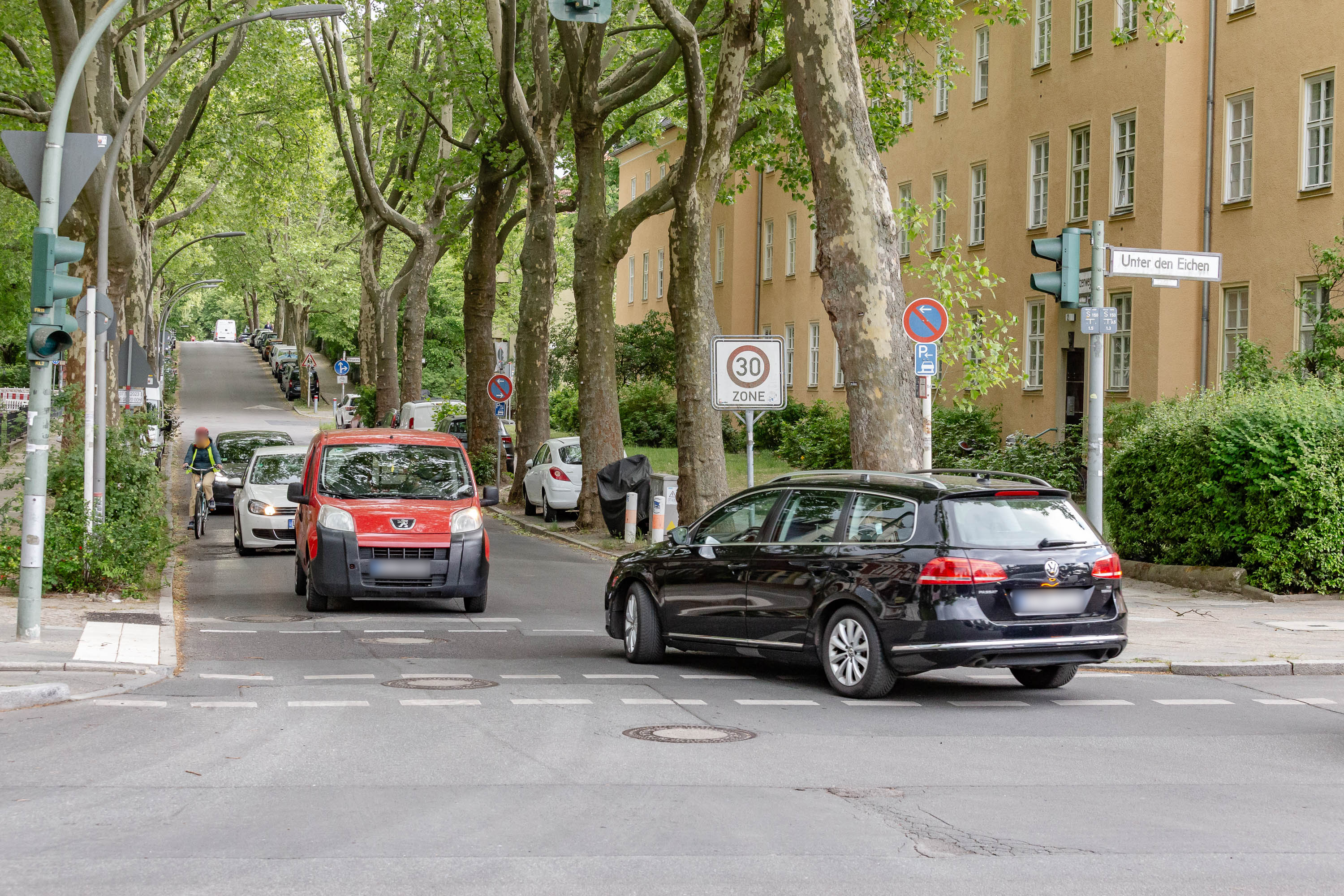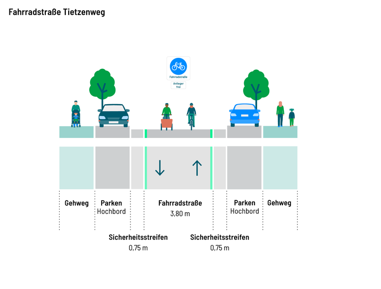 Der nördliche Tietzenweg zwischen Gardeschützenweg und Unter den Eichen wird von Autofahrer*innen oft als Durchfahrtstraße genutzt. Mit der Einrichtung als Fahrradstraße wird die Straße nur noch für den Anliegerverkehr zugelassen und die Verkehrssicherheit für Fahrradfahrende und Fußgänger*innen verbessert – davon werden auch die Kinder und Eltern der Kita Tietzenweg profitieren. Die Stellflächen auf dem Hochbord zwischen den Baumscheiben bleiben beidseitig erhalten, daneben wird ein Sicherheitstrennstreifen von 0,75 m markiert. Vor den Markierungen wird die Fahrbahnoberfläche saniert.