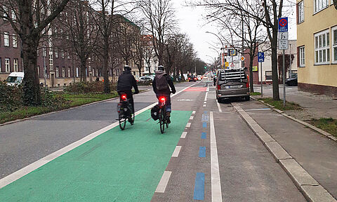 Auf der stark befahrenen Hauptverkehrsstraße zwischen Danziger Straße und der Straße Am Prenzlauer Berg sorgen farbige Beschichtungen für mehr Aufmerksamkeit aller Verkehrsteilnehmer*innen. Besonders morgens und abends nutzen zahlreiche Radfahrende den Schutzstreifen für ihre alltäglichen Wege.