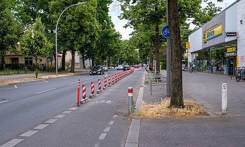 Auf der Bernauer Straße in Tegel fahren Radfahrende auf südlicher Straßenseite auf einem Schutzstreifen. Da es auf diesem immer wieder zu Park- und Halteverstößen durch Autofahrende kam, wurde auf dem Abschnitt vor der Hausnummer 69 (Supermarkt Edeka) ein geschützter Radfahrstreifen errichtet.