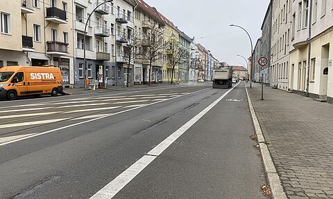 In Schöneweide entstand auf der Edisonstraße von der Wilhelminenhofstraße bis zur Zeppelinstraße ein Radfahrstreifen. Nachdem die BVG-Arbeiten abgeschlossen waren, konnte dieser nun markiert werden. Radfahrende erhalten so mehr Sicherheit im Straßenverkehr.