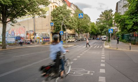 Mehr Platz und Sicherheit für Radfahrer*innen auf der Köpenicker Straße auf einem breiten Radfahrstreifen: Die hochfrequentierte Hauptverkehrsstraße verbindet zusammen mit der Schlesischen Straße Kreuzberg in nordwestlicher Richtung mit Mitte und in südöstlicher Richtung mit Treptow-Köpenick.…