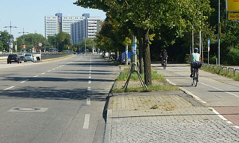 Auf der Herzbergstraße teilen sich Radfahrende, Autos und die Tram den begrenzten Raum. Weil der Straßenrand als Parkfläche genutzt wird, fahren Radfahrende bislang zwischen parkenden Autos und den Schienen, was Unfallgefahren birgt und zudem den Tramverkehr ausbremst. Zwischen Vulkanstraße und…