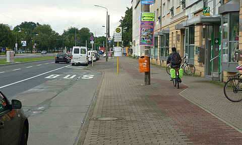 Die Müggelheimer Straße ist eine viel befahrene Hauptverkehrsstraße in Köpenick. Zwischen Wendenschloßstraße und Pablo-Neruda-Straße wurde auf südlicher Straßenseite ein Radfahrstreifen markiert.