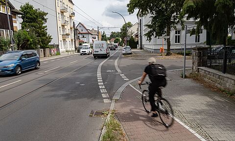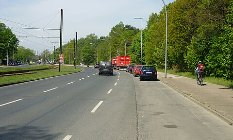 Die Straße An der Wuhlheide verbindet die Ortsteile Oberschöneweide und Köpenick. Hier wurde im Abschnitt zwischen Treskowallee und Spindlersfelder Straße auf der Nordseite ein Schutzstreifen für Radfahrende angelegt.