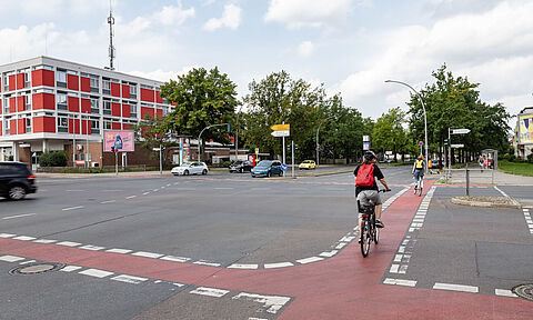 Auf insgesamt 30 Kreuzungen auf den Straßen Johannisthaler Chaussee, Neuköllner Straße und Rudower Straße wurden die Radfurten rot gefärbt. Die rote Signalfarbe macht den Radverkehr sichtbarer und sorgt für besondere Aufmerksamkeit dort, wo Radfahrende die Wege des Autoverkehrs kreuzen.