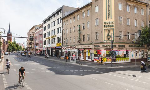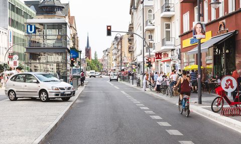 Die Karl-Marx-Straße ist geprägt von einem hohen Verkehrsaufkommen, Einzelhandel und intensiver Erdgeschossnutzung mit hoher Gewerbedichte. Die Radfahrstreifen zwischen Uthmannstraße und Kienitzer Straße werden grün markiert, um für Radfahrende zu sensibilisieren.