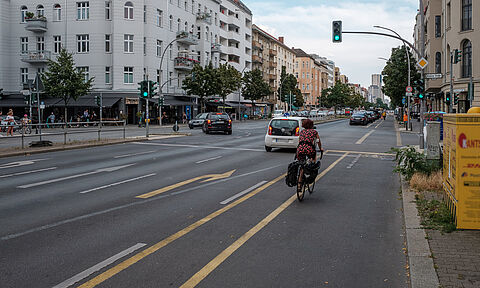 Die Kantstraße/Neue Kantstraße ist eine geschäftige Hauptstraße in Charlottenburg. Um kurzfristig mehr Platz für Radfahrende zu schaffen, wurden hier temporär Radfahrstreifen zwischen Messedamm und Budapester Straße eingerichtet, die bereits als dauerhafte Maßnahme vorgesehen sind.