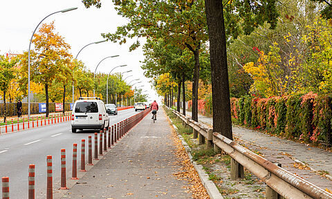 Die Falkenseer Chaussee ist eine beliebte Pendlerstrecke im Nordwesten der Stadt. Zwischen der Zeppelinstraße und der Mühlheimer Straße wurde die Verbindung für Radler*innen mit einem baullich getrennten Radweg verbessert.