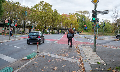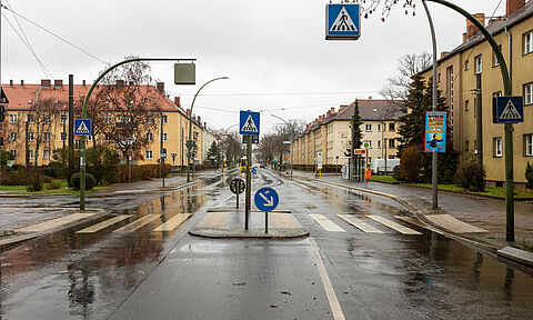 Eine neue Mittelinsel auf der Rennbahnstraße erleichtert Fußgänger*innen und Radfahrer*innen das sichere Überqueren der Straße.